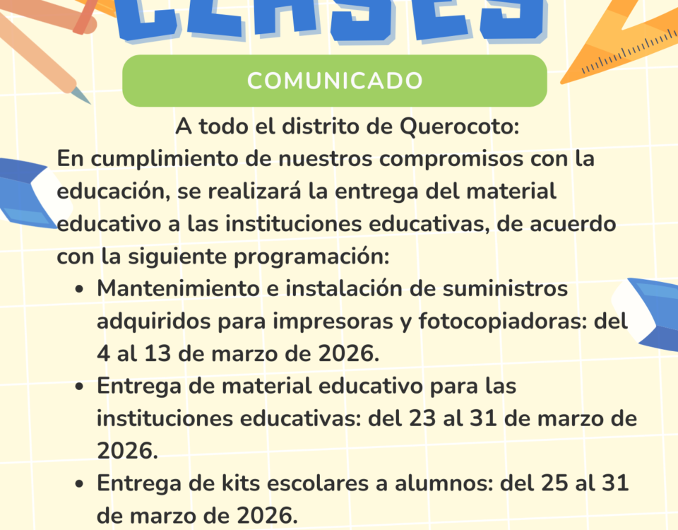 19 de mayo de 2023CONTRATACIÓN PARA LA EJECUCIÓN DE OBRA: INSTALACIÓN DE SISTEMA DE UTILIZACIÓN EN MT 13,2KV-1Ø, MRT; PARA LAS ANTENAS DE INTERNET BITEL SECTOR AYABAMBA-CP LA GRANJA Y SECTOR LA MONTAÑA DE LA COMUNIDAD CUNDIN CP PARAGUAY, DISTRITO QUEROCOTO”, PROVINCIA CHOTA, DEPARTAMENTO CAJAMARCA