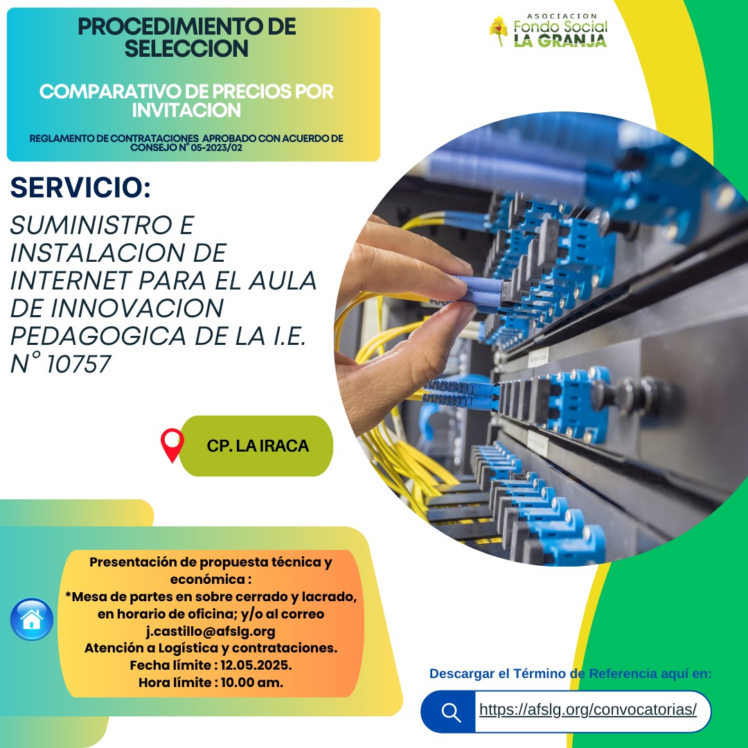 6 de mayo de 2025Published by admin on 6 de mayo de 2025Categories ConvocatoriasSERVICIO: Siuministro e instalación de internet para el aula de innovación pedagógica de la I.E. N° 10757 C.P. La Iraca.