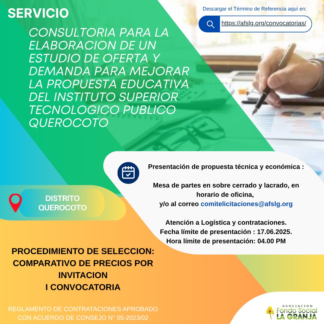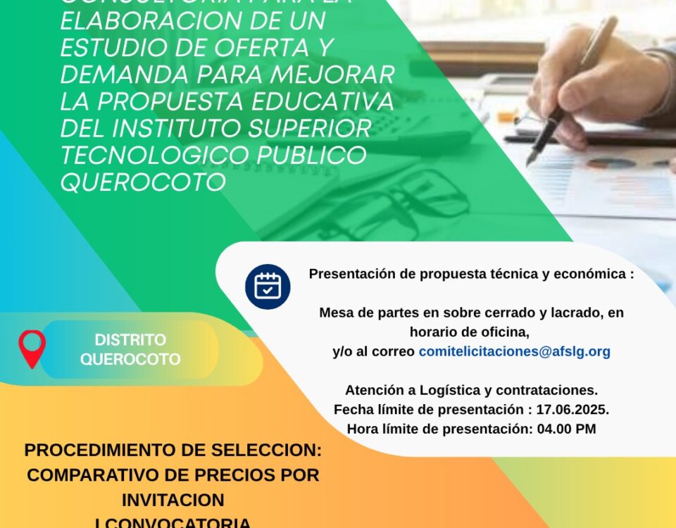 11 de junio de 2025Published by admin on 11 de junio de 2025Categories Convocatorias NoticiasSERVICIO: Consultoría para elaboración de un Estudio de Oferta y Demanda para mejorar la propuesta educativa del Instituto Superior Tecnológico Público Querocoto.