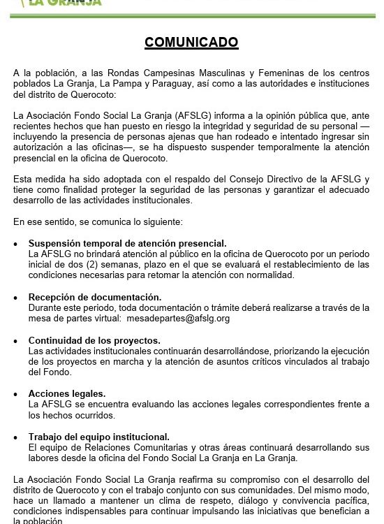 La Asociación Fondo Social La Granja (ASFLG) es una asociación civil sin fines de lucro que promueve el desarrollo social en el distrito de Querocoto, mediante la ejecución de proyectos que generan oportunidades y contribuyen a mejorar la calidad de vida de la población.