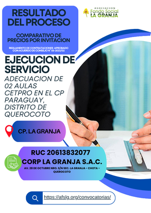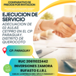PROCESO ADECUACION DE 02 AULAS CETPRO EN EL CP PARAGUAY 10.04.202510 de abril de 2025SERVICIO DE INSTALACION DE INTERNET 60 MBPTDR SERVICIO DE INSTALACION DE INTERNET 60 MBP + CABLEADO PARA 21 PC EN CP PARAGUAY – CETPROSERVICIO DE INSTALACION DE INTERNET 60 MBP11 de abril de 2025 Published by admin on 10 de abril de 2025 Categories Convocatorias Tags TERMINO DE REFERENCIA ADECUACION DE 02 AULAS CETPOR LA GRANJADescarga MODELOS DE ANEXOSDescarga Share0 admin Related posts29 de septiembre de 2025SERVICIO: Consultoría para la implementación de Proyecto Impulso Comercializador Sostenible a la Actividad Artesanal de las Tejedoras de la Zonal II y Zonal III.Read more24 de septiembre de 2025SERVICIO – Consultoría de obra para la supervisión de ejecución de obra del Proyecto: Obras Complementarias al Proyecto Mejoramiento del Servicio de Transitabilidad Vehicular y Peatonal en el Centro Poblado de Paraguay – Querocoto.Read more15 de septiembre de 2025EJECUCIÓN DE OBRA – PROYECTO: Individualización del servicio de energía eléctrica en comunidades de La Palma y La Fila del centro poblado de Paraguay, Querocoto.Read more Comments are closed.